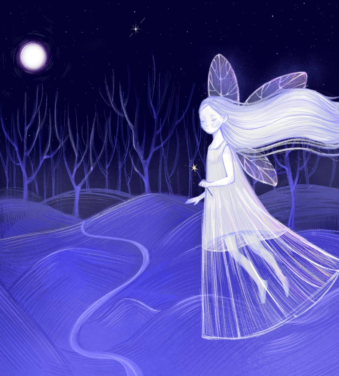 Иллюстрация к стихотворению Виталия Кораблёва «Сказка о ночной фее» Летает Фея над землёй под тихий звук органа, И покрывает пеленой индиговых туманов. Горит как светлый мотылёк, огнём неугасимым, И сказок вальс за ней плывёт, кружит неутомимо. Взмахнёт тростинкою своей, сон по земле польётся, И в небе первая звезда в сиянии проснётся.