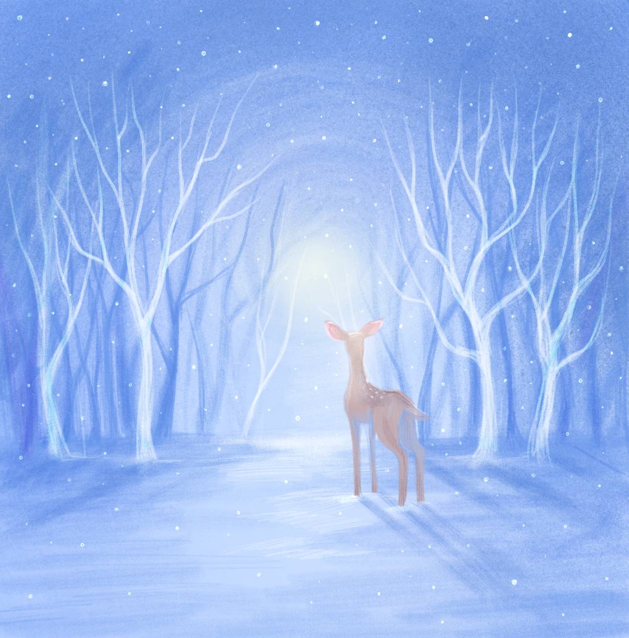 Иллюстрация к ненецкой сказке «Оленёнок» Совсем один оказался оленёнок. Вылез из сугроба, встал на свои маленькие ножки, оглянулся по сторонам и горько заплакал. Но тут что-то ласковое, тёплое, коснулось его глаз, согрело лоб, высушило слёзы. Это солнышко раздвинуло хмурые тучи и послало оленёнку свой лучик. Обогрело солнышко оленёнка и сказало: — Не плачь, малыш. Иди на север, всё время на север, пока не выйдешь к большой реке. Там и найдёшь оленей. А я тем временем растоплю снег, чтобы идти тебе было легче. Обрадовался оленёнок, поблагодарил доброе солнышко и побежал на север догонять оленей.