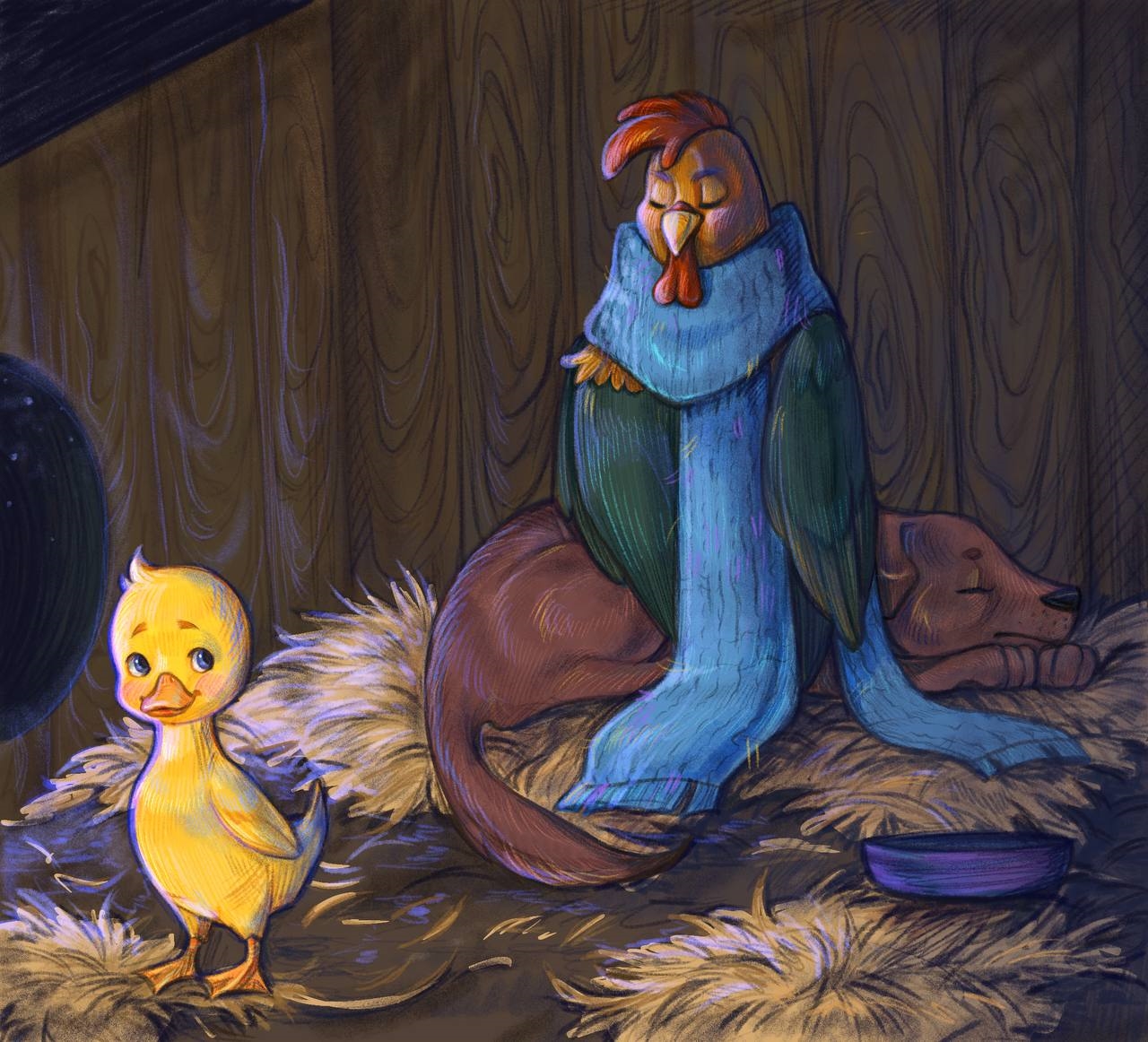 Иллюстрация к сказке Виталия Кораблёва «История о том, как Утёнок помог Петуху поверить в свои силы» — Что же делать? Как быть? — оказывается, Петух накануне попил холодной воды и у него пропал голос. Если он не сможет разбудить жителей двора, начнётся такая неразбериха. — Я постараюсь вам помочь. Надо, чтобы вам стало тепло, а самое тёплое место — в будке у Шарика! — Дядя Шарик, — постучался в будку Утёнок. — Гав, гав, — сердито залаял пёс, — я сплю, и ты иди подобру-поздорову. — Не гоните меня, у нас беда, — и Утёнок рассказал обо всём Шарику. — Я так понимаю, ты хочешь подселить ко мне Петуха? — Хочу! Очень хочу! Вам вдвоём будет очень тепло, а ещё надо замотать горлышко Петуху вот этим шарфиком, — и Утёнок показал на забытое высохшее бельё на верёвке. — Р-Р-Р! — зарычал пёс. — Это хозяйский шарф. Эх, — высоко подпрыгнув, Шарик сбросил шарф на землю, — веди своего Петуха. Утёнок со всех лапок бросился к Петуху. — Я в будку? Ни за что, — сипло отнекивался Петух. — А как же утро? — напомнил ему Утёнок. — Главное, чтобы никто не узнал, — забившись в дальний угол будки, обмотанный шарфом, шептал Петух. — Хватит причитать, — ворчал Шарик. Наконец, оба заснули. А Утёнок уселся на бугорок и стал ждать рассвета. Всю ночь малыш не сомкнул глаз. И вот первый лучик восходящего солнца радостно показался из-за высокого дерева…