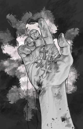 Анастасия КОРАБЛЁВА (г. Ясиноватая, ДНР, Россия) Номинация «ИЛЛЮСТРАЦИЯ КНИГ» Иллюстрация к рассказу Виталия Кораблёва «Семь крестов – семь спасённых душ» Шёл бой, нам был дан приказ держать позиции до тех пор, пока артиллерия не произведёт необходимый манёвр. Все прекрасно понимали, что в этом бою мало кто выживет, и жадно вдыхали последние глотки воздуха. Среди нас был боец преклонных лет, с позывным Пономарь, он был верующим, служил до войны пономарём в одном из православных храмов Донецка. Пономарь приподнялся в окопе чуть выше всех нас, не считаясь со смертельной опасностью, и сказал такие весомые и простые слова: - «Братья, пацаны, мужики, смерть уже рядом, так давайте примем её без малодушия и предательской трусости». Он достал затёртый молитвослов и стал громко молиться. И тут, произошло невероятное - враг совершенно затих, каждое слово молитвы пронзало наши сердца. Пономарь спросил, кто из нас не крещёный, оказалось, из семидесяти бойцов – семеро, неожиданно он им предложил креститься, прямо в этой кровавой каше, принять Христа! Я не знаю, правильно ли он поступал по церковному уставу, имел ли он на это право, но бойцы, тут же, не задумываясь, согласились. Пономарь полез рукой в свои обляпанные кровью и грязью карманы и достал семь алюминиевых крестов. Мы, как завороженные, смотрели на чудо, происходящее на наших глазах, а Пономарь продолжал таинство крещения.– Вот, и помирать теперь не страшно, – по завершении сказал Пономарь, и сразу же, в нашу сторону полетели тонны раскалённого металла. От протяжного свиста и воя, взрывов и до небес подрываемой земли, мы не слышали и не видели белого света. Через час орудия умолкли, и мы, осмотревшись, поразились тому, что все остались целыми и невредимыми, и лишь Пономарь лежал с проступившими на спине кровавыми пятнами, закрывая своим телом молодого бойца.