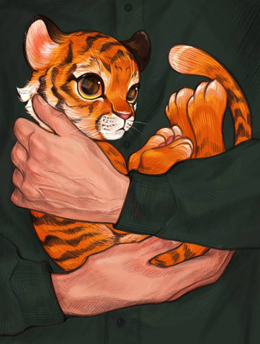 Иллюстрация к рассказу Виталия Кораблёва «Матрос-пограничник» Забившись в траву, тигрёнок пугливо озирался по сторонам. — Тихо, — предупредил рядовой Кузнецов и рукой указал на кровавый след, уходящий в сторону границы. Бесшумно группа пошла по следу. —Товарищ сержант, а тигрёнка куда? — Кузнецов вопросительно посмотрел на меня. —Ну, что делать? Бери, только учти, в части будем «отстреливаться» вместе. Кузнецов моментально спрятал тигрёнка в своих огромных ручищах. Через час настигли браконьеров. Это были местные, живущие в соседнем посёлке. Пришлось вызывать милицию и егеря.