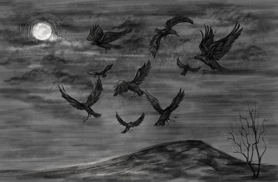 Иллюстрация к рассказу Виталия Кораблёва «Один день из жизни героя» Просматривая в бинокль буквально каждый сантиметр, я увидел, как за возвышенностью, вверх, взметнулась стая воронья, пирующая на остатках, некогда живой, силы противника. Падальщики долго кружились над одним местом, посылая своим карканьем проклятия на тех, кто им помешал трапезничать. Вот тут я и понял, что именно за этим бугром сосредоточен боевой кулак врага. Долго не думая, я доложил командиру о своем предположении, и скоро наши грады просто смели весь плацдарм подготовленного противником наступления. Враг был разбит, а мы смогли занять более выгодные позиции и, наконец-то, отдохнуть.